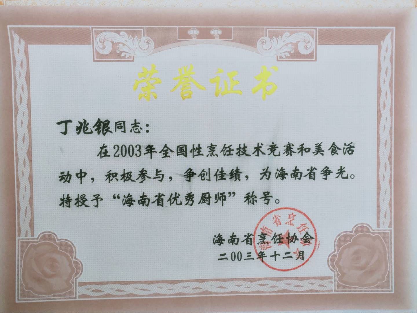 2003-丁兆银-海南省优秀厨师