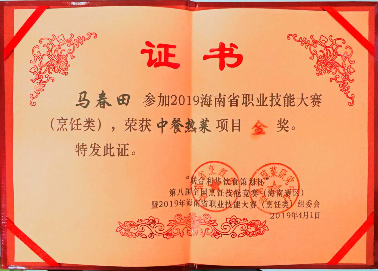 2019-马春田-海南省职业技能大赛中餐热菜金奖